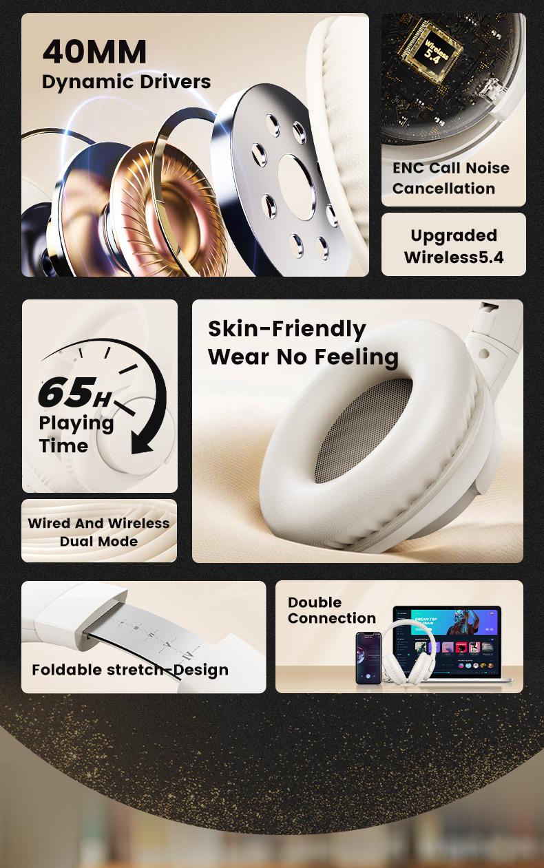 【NO Anc】Electronic Wireless Bluetooth Headphones Over-Ear, Deep Bass Hi-Fi Stereo, 65H Playtime, Foldable Lightweight Headset with Mic for Ios/Android/Pc Headset Earbud Headphonesbluetooth Black #Warmupforholidays