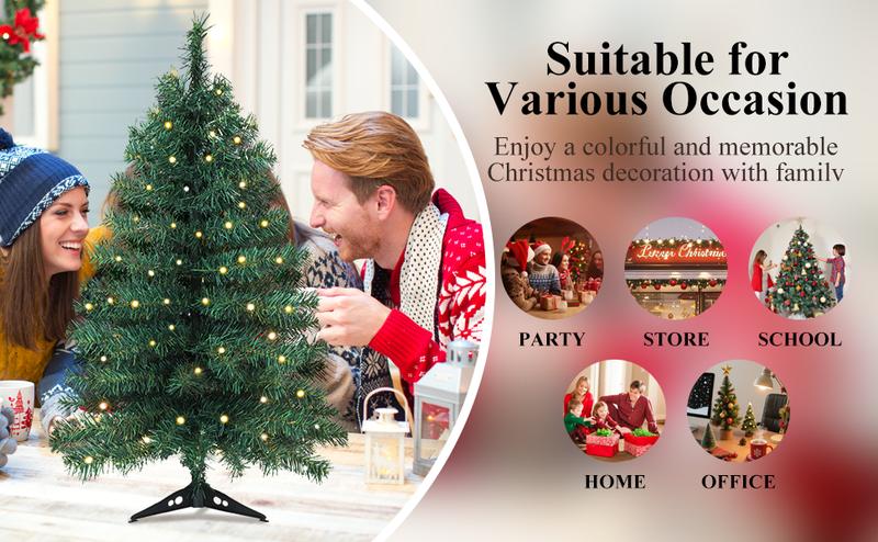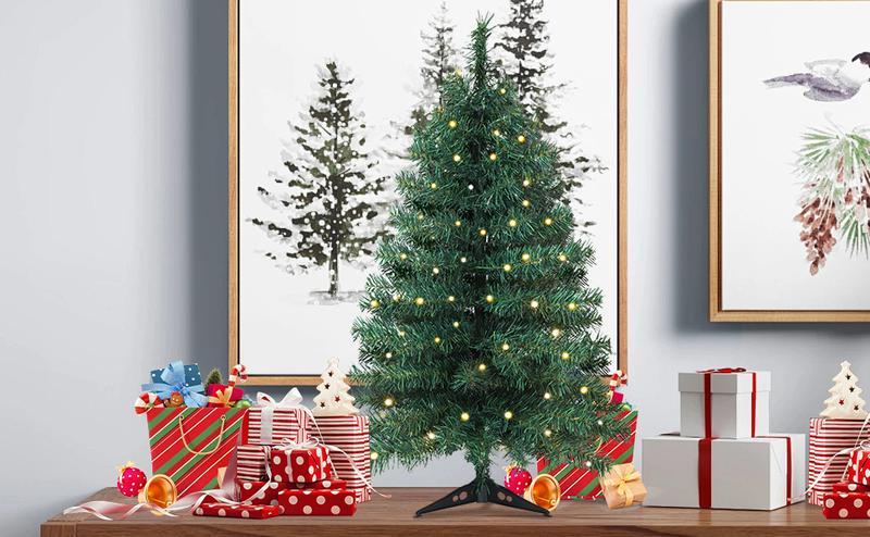 Okicoler 3 Ft Pre-Lit Christmas Tree, Artificial Christmas Trees with Lighting, Xmas Trees with 25 Led Lights, 100 Branch Christmas Decoration for Home, Office, Easy Assembly